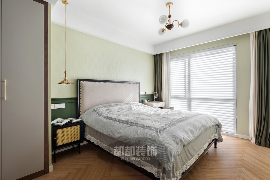 根据夫妻俩的要求,卧室用了比较清新、舒缓的色调,为睡眠提供优质环境。复古绿+浅豆绿拼色墙壁,琉璃床头灯雅致温馨,躺在柔软的大床上,也会梦到开满玫瑰的女巫花园吧。卧室舍弃卫生间,让空间看上去更宽敞,也增加了衣柜容量,女主人再多衣服也装得下啦! 主卧窗帘也采用了拼色设计,梦幻帘是为阳光蒙上柔和滤镜,洒满一室的朦胧温柔。一侧床头柜改成梳妆台,白色组合柜+软包座椅精致感满满,金属元素的点缀更显大气,早上起床在这里美美撸个妆,开启元气满满的一天吧!