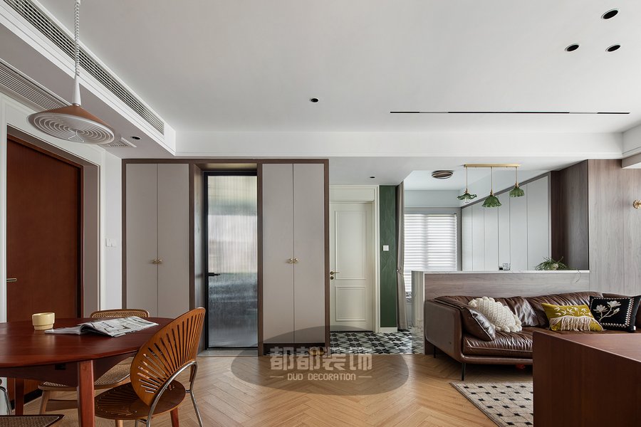 一推开门浓郁的中古风情就扑面而来,长虹玻璃矮脚柜、北美黑胡桃木电视柜、巧克力色皮质沙发、金属细腿小茶几、短毛地毯,这几个元素组合在一起,浓浓的胶片感满溢出来,仿佛能瞬间穿越美式复古电影;铃兰花灯具则为空间注入一丝甜美。 客厅做回字形吊顶,在视觉上拉高层高更显空阔,电视背景墙大胆使用大白墙,搭配北美黑胡桃木电视柜,宝石蓝色花盆和绿植作为点缀,复古意味十足。因为户型较小,更适合小体量家具,设计师则通过在电视柜旁增加斗柜来增强客厅的收纳能力。 设计师为天生精致浪漫的女主人保留了飘窗的设计,靠墙角增加一排顶天立地的开放式收纳柜,放上摆件和相框,闲暇时候夫妻两一起坐在这里,沐浴着温柔的阳光,一起重温照片里的美好瞬间,这就是平淡日子里的闪光点。 巧克力色皮质双人沙发柔软奢华,搭配金丝绒植物刺绣和流苏装饰抱枕,真皮的优越质感与奢华的金丝绒相碰撞,置身客厅仿佛就能听到隐隐约约的古典钢琴曲,藤编果篮在此刻也仿佛定格成一幅油画。