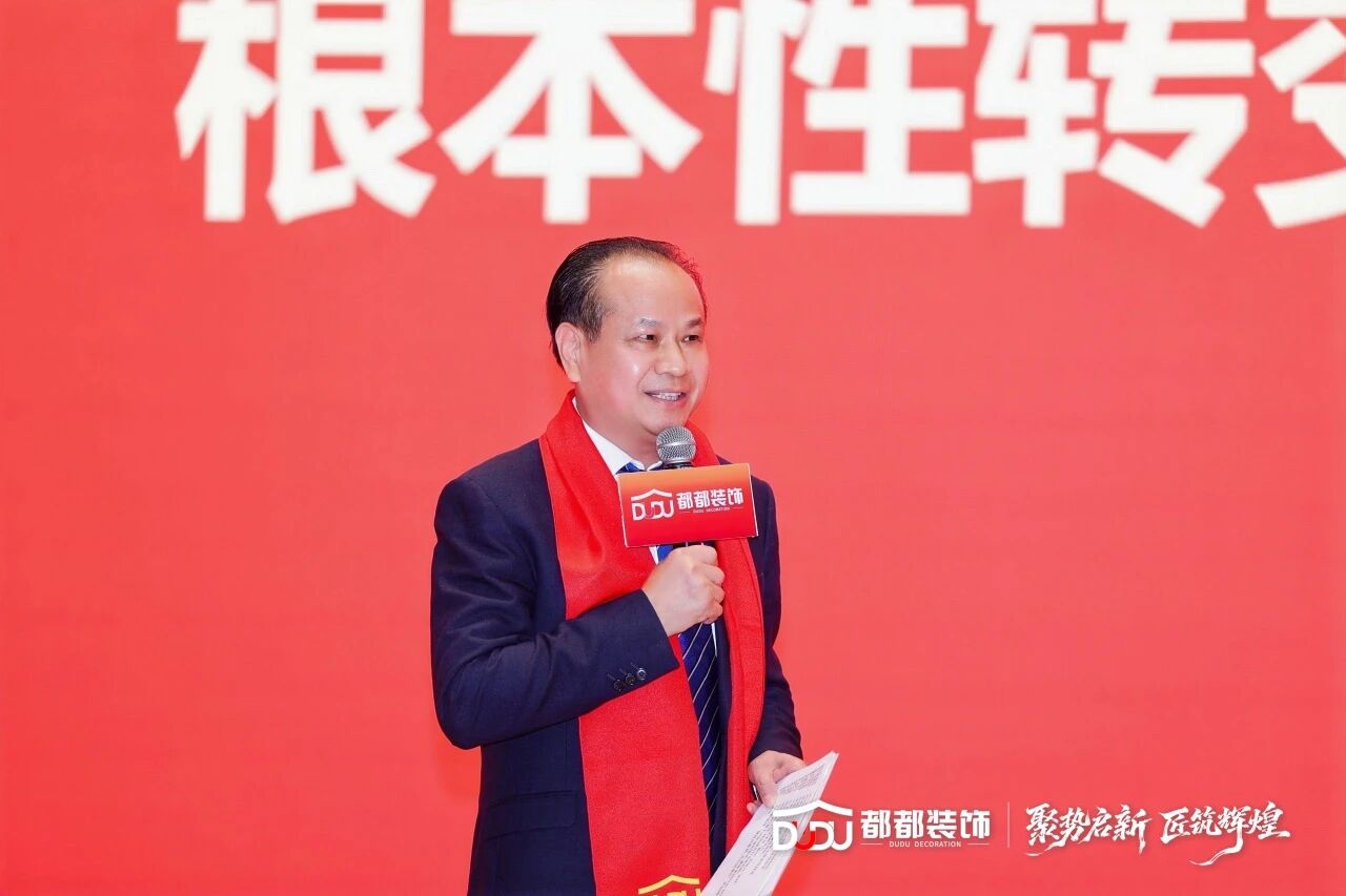大会接近尾声,在一阵阵激烈的掌声中,都都装饰集团董事长都宜贵先生上台致辞: