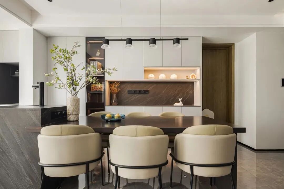 桌椅:多人家庭建议选圆桌,空间小选长桌。木质、石材餐桌比较百搭,能够适配各种风格的餐厅。