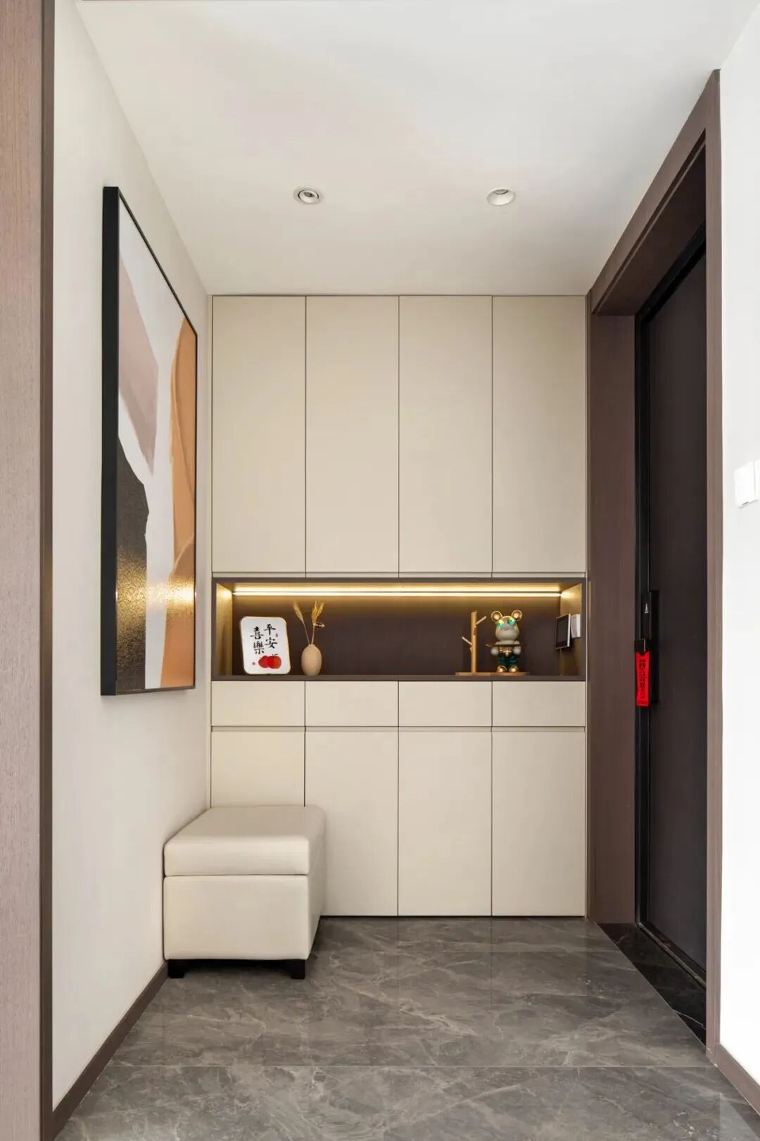 换鞋凳:一般换鞋凳高度在40-45cm,如果玄关空间小,可以直接和定制柜做一体化处理。