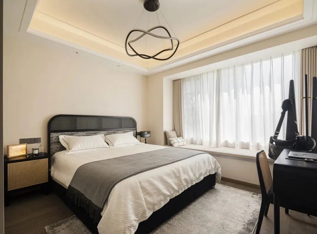 窗帘:最好选择双层窗帘,一层纱帘制造氛围感,一层遮光帘遮光隔音保温,遮光帘可以选择涤纶、棉麻或丝绒材质,遮光隔音效果好。