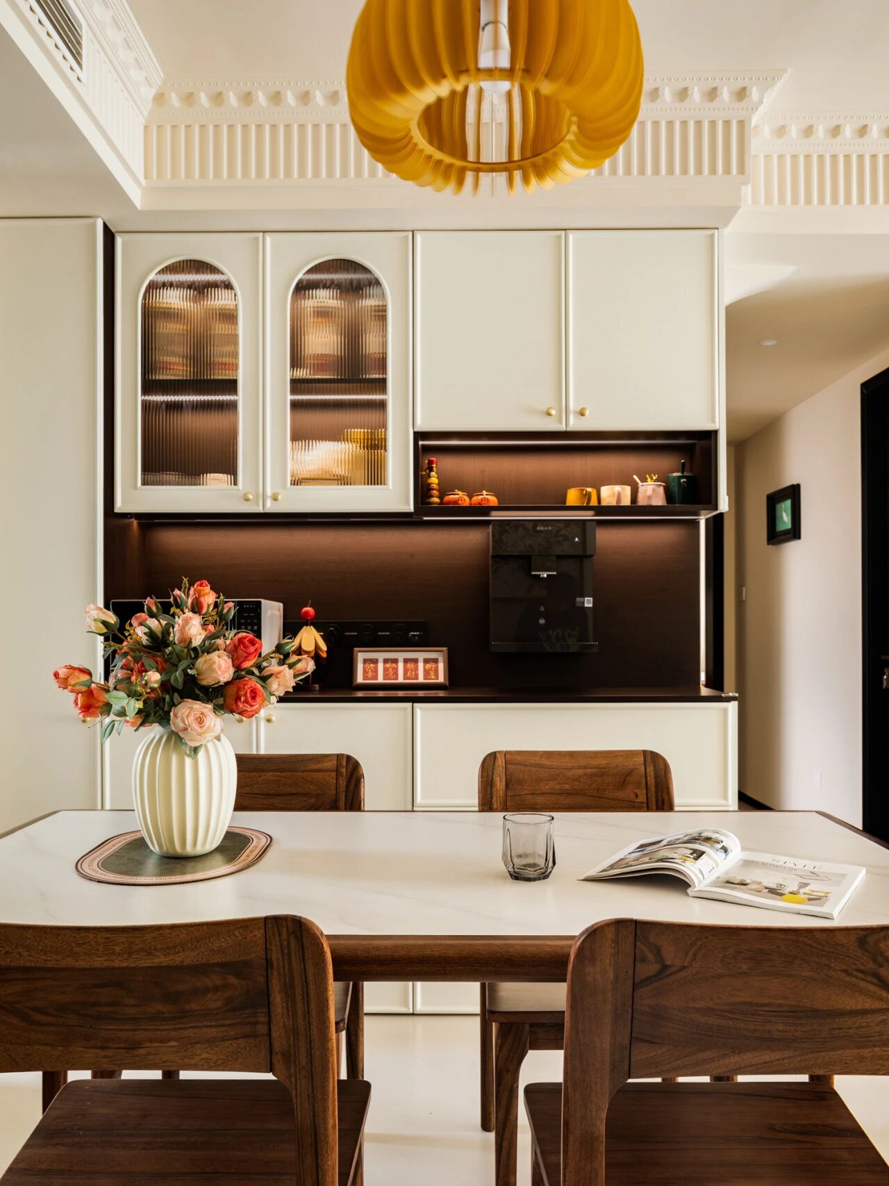 而对于喜欢收集漂亮杯子的人来说,餐边柜可以单独做一个展示杯子的区域,装上玻璃柜门,美观又防尘。