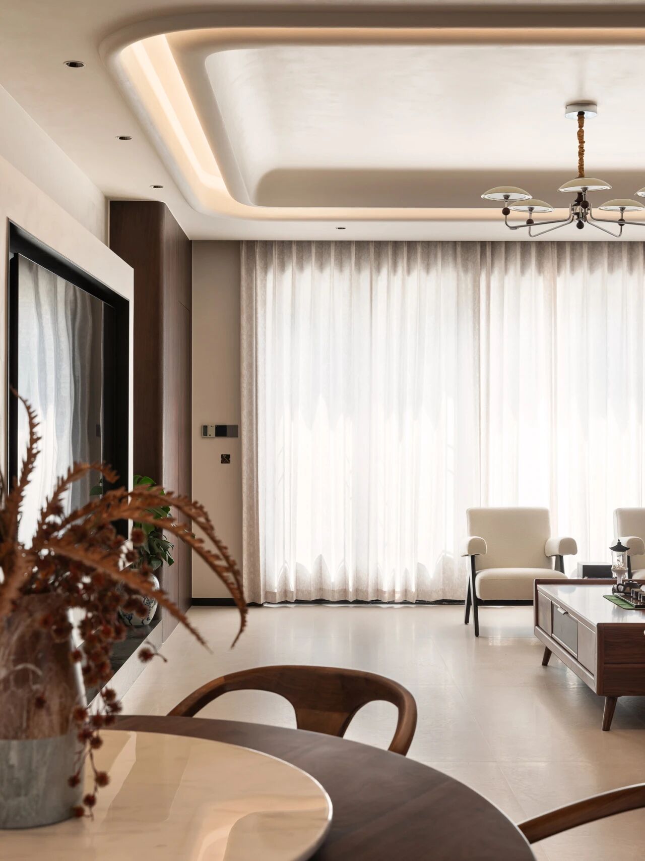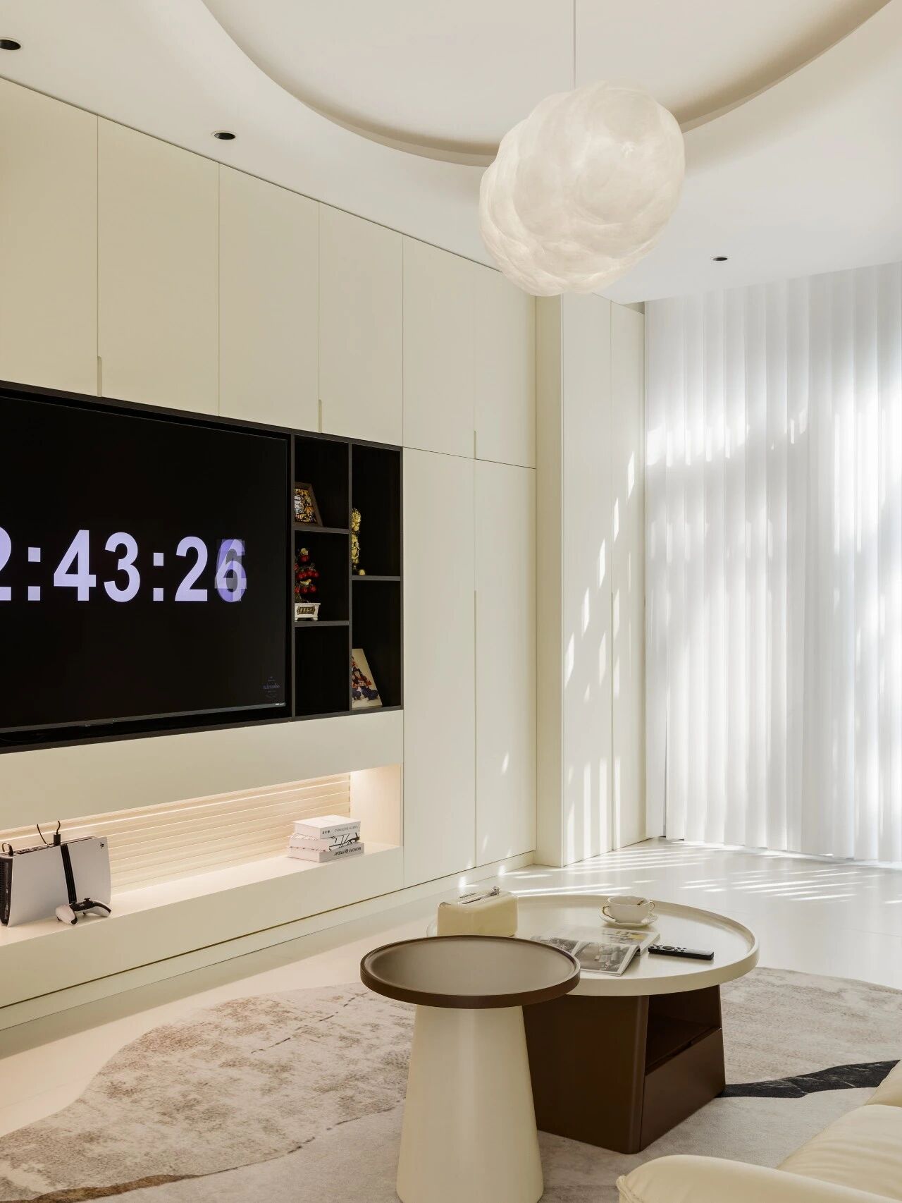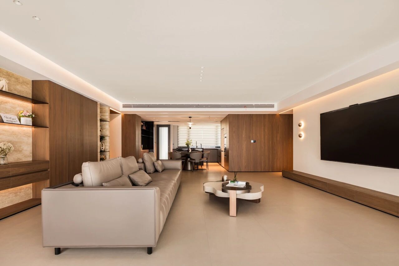 沙发选择一字型,茶几选择轻量,或者现在流行的移动小边几,没有了堆杂物的空间,客厅也会更加清爽干净。